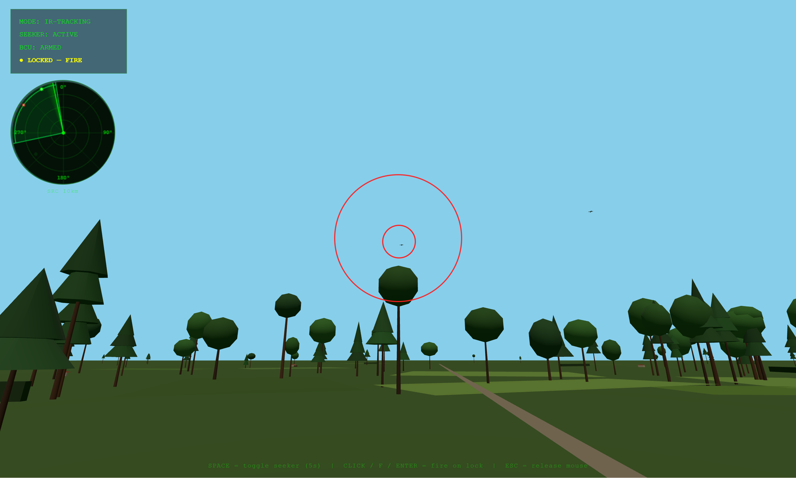 This is a surface to air missile simulator with functunality similar to war thunder's SAM IR missile system in terms of target asquisition and such. the planes have a realistic damage model and the ai can dodge or use flares to evade the missile, your FIM-92 stinger has IRCCM but it can sometimes be defeated (15% chance based on things such as angles, speed, etc...)